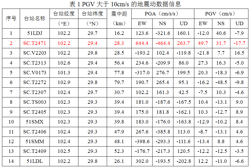2022年9月5日12時(shí)52分,四川省甘孜州瀘定縣發(fā)生6.8級(jí)地震,我所強(qiáng)震動(dòng)觀測(cè)中心在震后共收集處理距震中100公里范圍內(nèi)強(qiáng)震動(dòng)記錄110組。其中PGV大于10cm/s的數(shù)據(jù)14組,PGV大于20cm/s的數(shù)據(jù)6組,基本信息見下表1。本次地震的卓越頻率范圍較寬,不同臺(tái)站區(qū)別較大,如SC.W3509臺(tái)站記錄到的地震動(dòng)卓越頻率在5Hz左右,SC.T2313臺(tái)站記錄到的地震動(dòng)卓越頻率在2.5Hz左右,SC.T2302臺(tái)站記錄到的地震動(dòng)在1Hz左右有明顯的峰值,且其在0.1-1.2Hz范圍內(nèi)均具有比較豐富的頻率成分。