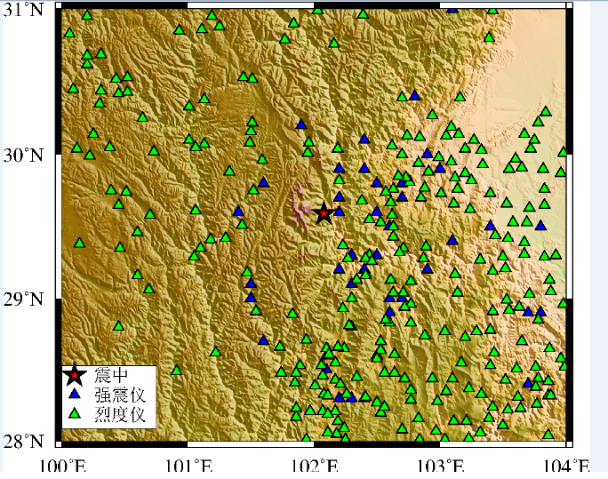 強震數據的收集與處理:震后第一時間收集了此次地震的強震儀與烈度儀數據,臺站分布圖與震中分布圖詳見圖1。