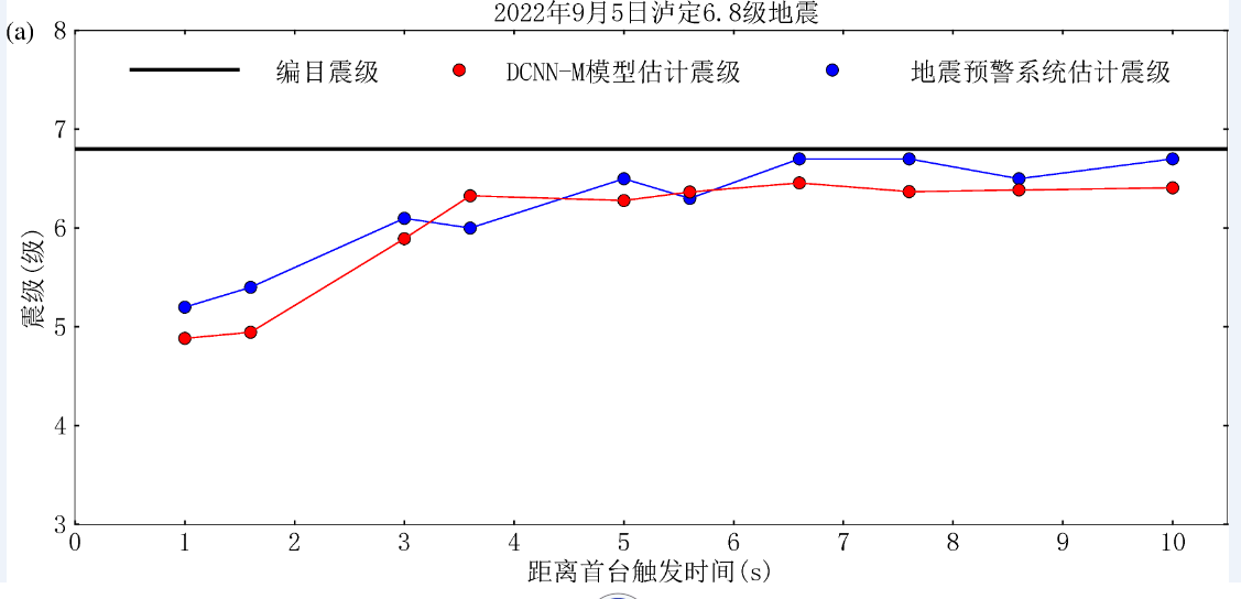圖3展示了人工智能DCNN-M震級估算結果隨時間變化的過程,可以看到,在此次瀘定6.8級地震中,首臺觸發后1秒人工智能與傳統震級估算模型都可以給出震級估算結果,首臺觸發2秒后人工智能震級估算結果上升速率較傳統震級估算模型更快,首臺觸發后3.5秒人工智能震級估算結果為6.2級、較傳統震級估算模型更接近編目震級,隨后人工智能震級估算結果知道首臺觸發后10秒都穩定在6.3級,與傳統震級估算模型相當。