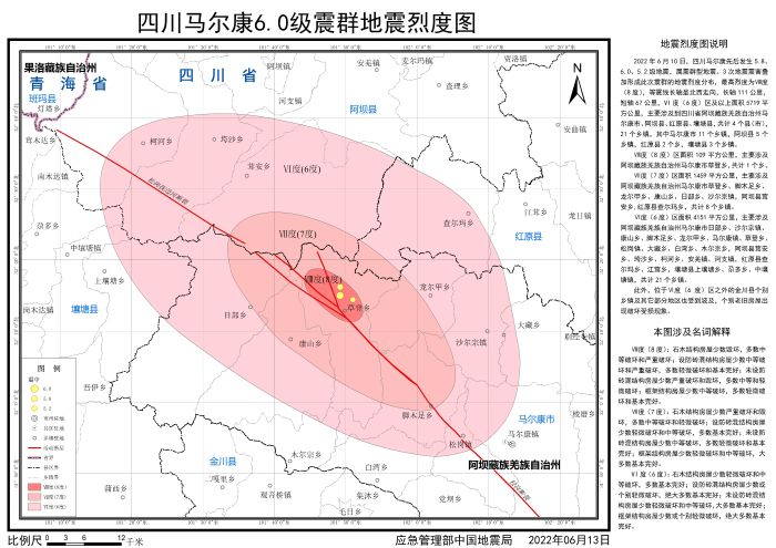 發布時間: 2022-06-22 點擊數量:54292022年6月10日,四川阿壩州馬爾康市先后發生5.8、6.0、5.2級地震,屬震群型地震。地震發生后,按照應急管理部部署,中國地震局組織四川省地震局開展應急處置工作,依照《地震現場工作 第3部分:調查規范》(GB/T 18208.3-2011)、《中國地震烈度表》(GB/T 17742-2020),通過災區震害調查,并綜合應用儀器烈度、地震構造背景、余震分布、震源機制、遙感影像等科技支撐成果,確定了此次地震的烈度分布,并依照《地震烈度圖制圖規范》(GB/T 38226-2019)編制完成《四川馬爾康6.0級震群地震烈度圖》。