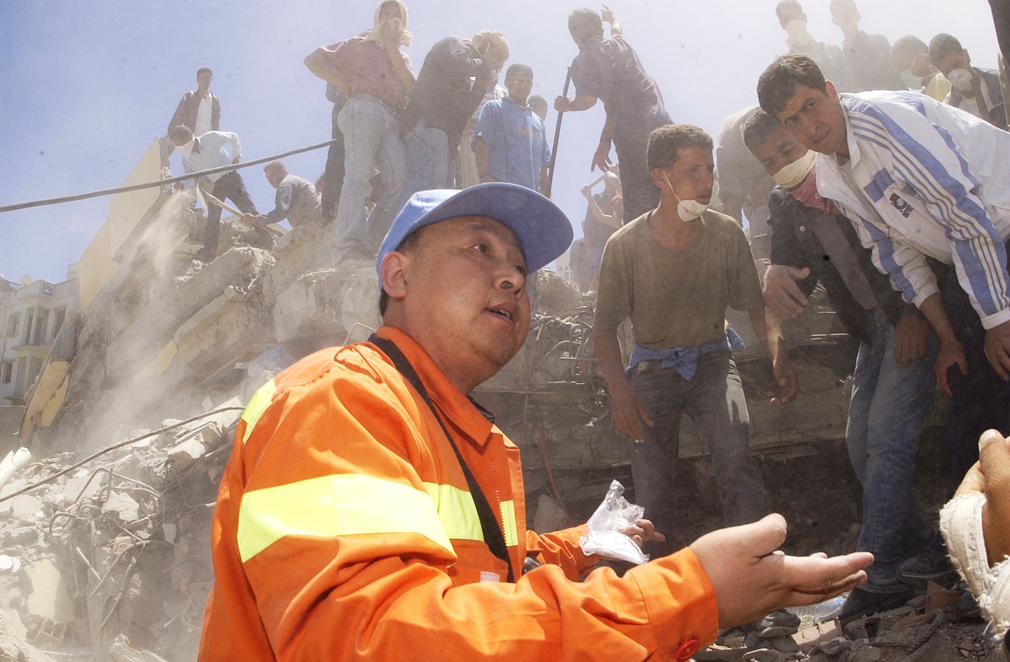 發布時間: 2023-08-02 點擊數量:6448走進位于哈爾濱市南崗區的中國地震局工程力學研究所(簡稱“工力所”),文化墻上的一幅照片格外引人注目:震后的斷壁殘垣間,深膚色卷頭發的救援人員圍住一位中國專家,他身穿橘黃色國際救援隊服,正全神貫注地講解著。這是工力所二級研究員、博士生導師孫柏濤,作為中國國際救援隊專家參與指導2003年阿爾及利亞地震現場救援的場景。