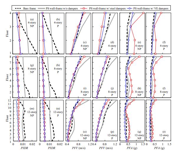 鉸支墻可以增加結(jié)構(gòu)沿高度方向的連續(xù)剛度并使層間位移分布更為均勻,從而避免框架結(jié)構(gòu)出現(xiàn)薄弱層破壞。然而,現(xiàn)有研究對(duì)鉸支墻-框架結(jié)構(gòu)的樓面速度和加速度反應(yīng)關(guān)注較少,而這些反應(yīng)主導(dǎo)了建筑物非結(jié)構(gòu)構(gòu)件的地震損傷。本文通過(guò)數(shù)值模擬評(píng)估了鉸支墻-框架結(jié)構(gòu)的樓面速度和加速度反應(yīng),重點(diǎn)研究了使用不同類(lèi)型阻尼器對(duì)其的影響。此外,還通過(guò)結(jié)合最大峰值層間位移角、平均峰值樓面速度和平均峰值樓面加速度作為工程需求參數(shù)進(jìn)行了多維地震易損性分析。