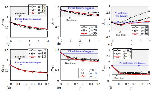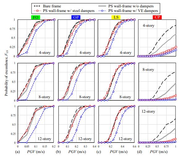 本文通過(guò)非線性時(shí)程分析和多維地震易損性分析,研究了兩種阻尼器(即摩擦型阻尼器和黏彈性阻尼器)在減小鉸支墻-框架結(jié)構(gòu)層間位移、樓面速度和加速度地震反應(yīng)中的作用。可以得到以下結(jié)論: