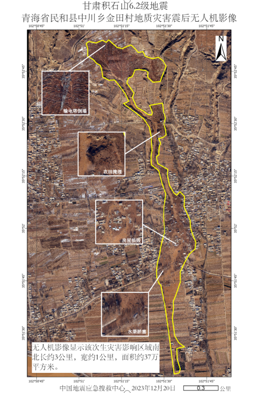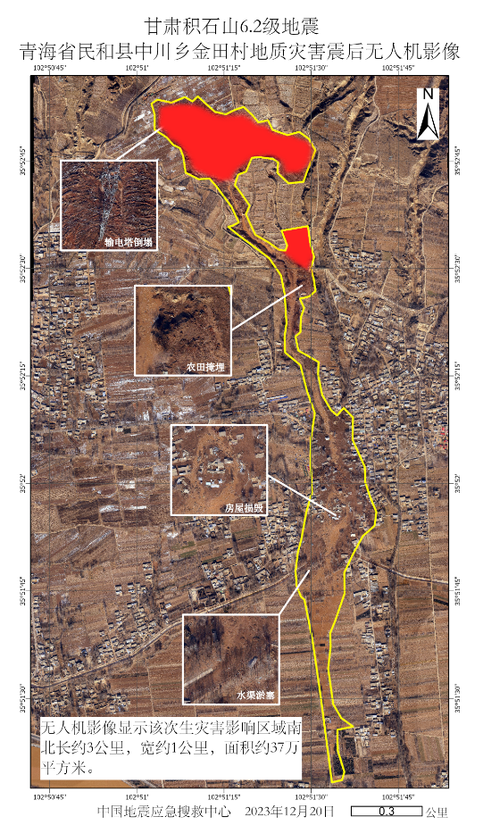 發布時間: 2023-12-25 點擊數量:47882023年12月18日23時59分,甘肅省臨夏積石山縣發生6.2級地震。此次地震已造成部分房屋損毀甚至倒塌,并由此造成人員傷亡。除房屋倒塌外,此次地震在青海省海東市民和縣中川鄉金田村和草灘村引發了被稱之為“砂涌”的特殊現象,區域內部分房屋被厚達數米的流滑土壤掩埋(圖1)。