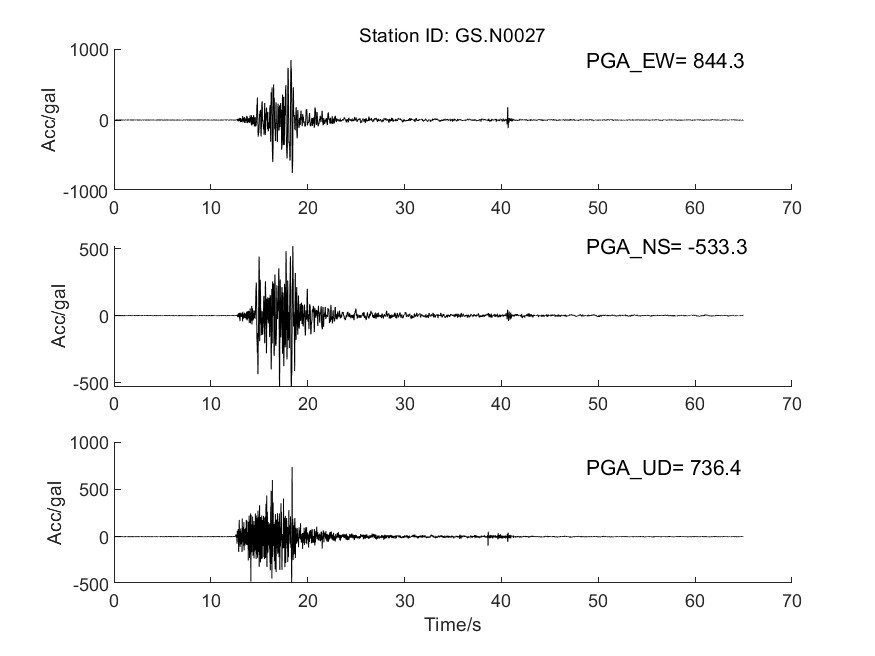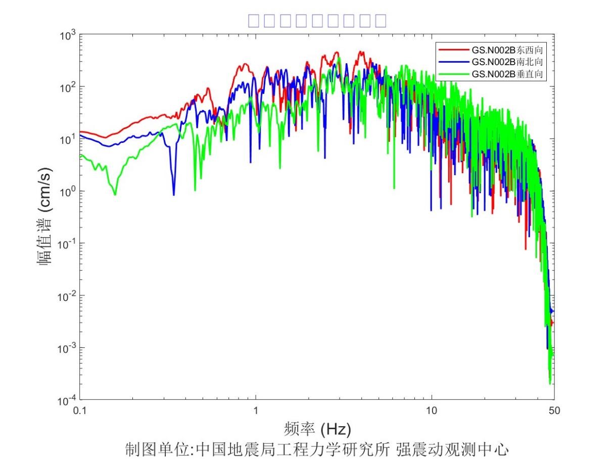 地震后工力所強震動觀測中心共收取距震中100公里范圍內實時強震儀記錄57組、烈度儀記錄182組。中心立即組織人員進行處理。獲取記錄臺站加速度記錄分析結果見表1,其中GS.N0028 臺烈度最大,其震中距為13.6km,東西、 南北、 垂直向加速度峰值分別為 905.8cm/s2、778.5cm/ s2、-702.4cm/ s2,東西、南北、垂直向速度峰值分別為57.3cm/s、-52.1cm/s、-16.3 cm/s,計算儀器地震烈度9.5度。GS.N002B 臺峰值加速度最大,其震中距為12.3km,東西、 南北、 垂直向加速度峰值分別為 1071.4cm/s2、856.8cm/ s2、796.1cm/ s2,東西、南北、垂直向速度峰值分別為-30.7cm/s、-21.5cm/s、-10.1 cm/s,計算儀器地震烈度9.2度。GS.N0027臺震中距最小,其震中距為5.8km,東西、南北、垂直向加速度峰值分別為823.9cm/s2、-533.3cm/ s2、 692.7cm/ s2,東西、南北、垂直向速度峰值分別為-39.8cm/s、-28.9cm/s、-11.3 cm/s,計算儀器地震烈度8.8度。儀器地震烈度分布圖見圖1,地震峰值加速度分布圖見圖2,地震峰值速度分布圖見圖3,地震加速度反應譜(T=0.3s、T=1.0s、T=3.0s)分布圖見圖4、圖5、圖6,GS.N0028 臺強震動記錄見圖7,GS.N0028臺加速度反應譜見圖8,GS.N0028臺傅里葉幅值譜見圖9,GS.N002B臺強震動記錄見圖10,GS.N002B臺加速度反應譜見圖11,GS.N002B臺傅里葉幅值譜見圖12,GS.N0027臺強震動記錄見圖13,GS.N0027臺加速度反應譜見圖14,GS.N0027臺傅里葉幅值譜見圖15。