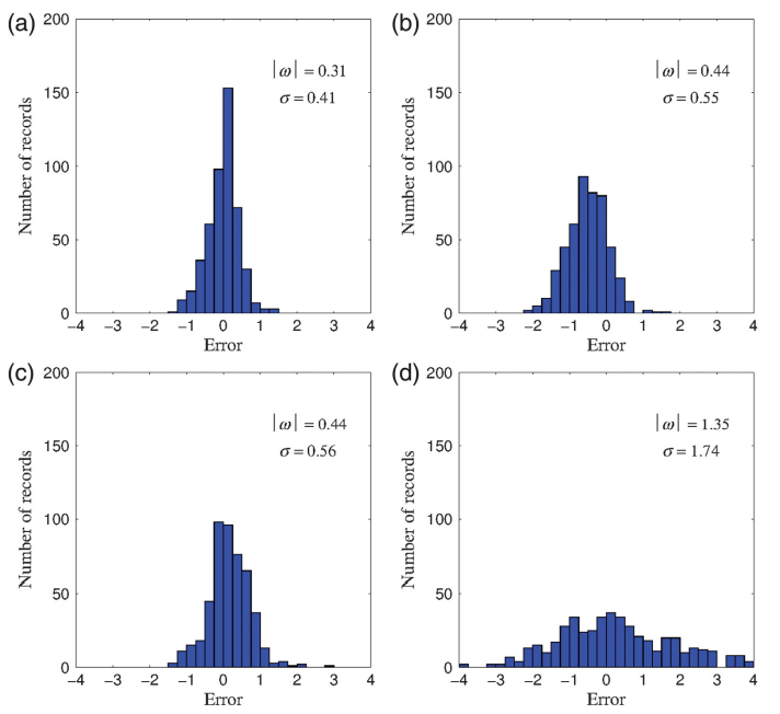 圖1 P波到達后3秒時,(a)TLSVM-M模型、(b)SVM-M模型、(c)Pd方法和(d)?c方法的震級估計誤差分布