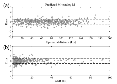 圖2 P波到達后3秒,基于TLSVM-M模型的單臺震級估計誤差與(a)震中距和(b)信噪比的關系