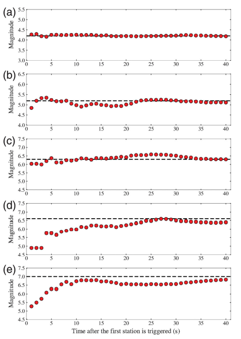 圖3 首臺觸發后,五次地震事件的震級估計隨時間的演化