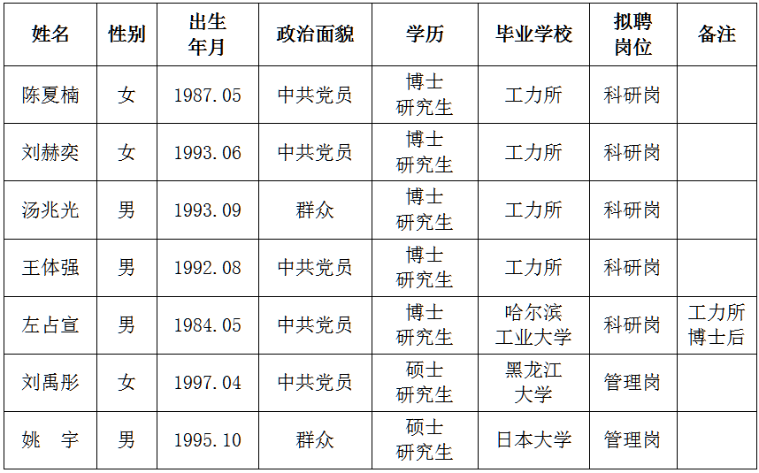 發布時間: 2022-05-30 點擊數量:8409根據中國地震局《關于貫徹執行〈事業單位公開招聘人員暫行規定〉的通知》文件精神和我所用人計劃,經公開發布招聘信息、資格審查、面試等程序確定擬錄人員。現將擬錄人員相關情況公示如下,公示期7天,期間如有異議請與中國地震局工程力學研究所人才資源部或紀檢室聯系,以個人名義反映情況的須署真實姓名,以單位名義反映情況的須加蓋公章。
