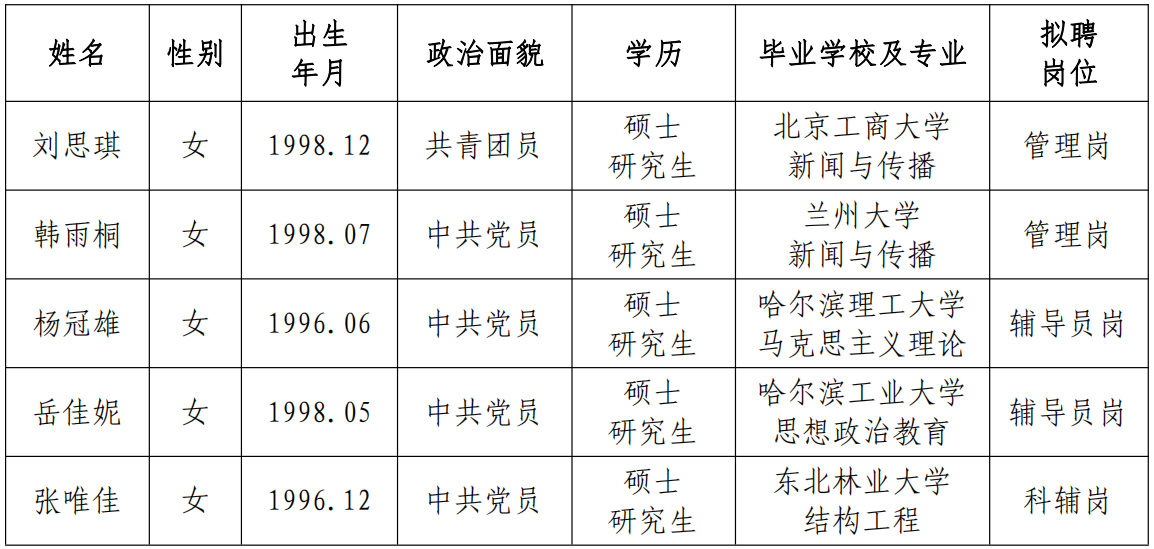 根據中國地震局《關于貫徹執行<事業單位公開招聘人員暫行規定>的通知》文件精神和我所用人計劃,經公開發布招聘信息、資格審查、面試等程序確定擬錄人員。現將擬錄人員相關情況公示如下,公示期7天,期間如有異議請與中國地震局工程力學研究所人才資源部或紀檢室聯系,以個人名義反映情況的須署真實姓名,以單位名義反映情況的須加蓋公章。